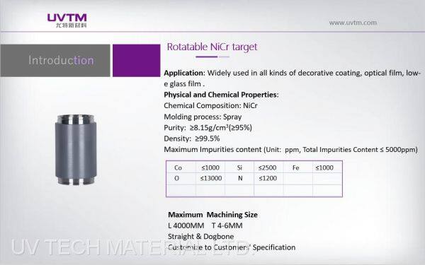 Home > Products > Rotatable Sputtering Target > NiCr Target UVTM Alloy Target for Magnetron Sputter Coating Low e Glass Nano Thin Film