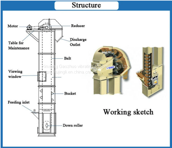 The bucket elevator, as material conveying solution, is composed of material conveying mechanism (buckets and conveying rubber belt), upper section with transmission drum, lower section with stretching drum, housing at the medium section, drive mechanism, non-return brake apparatus.