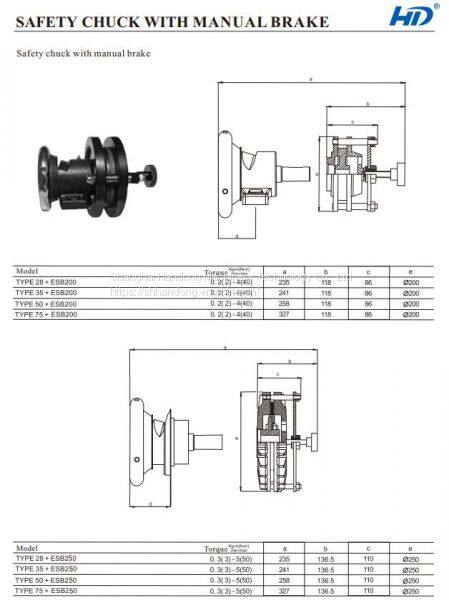 This manual brake can be used independently and also can be matched with safety chuck for usage. There are two models if it, ESB200 and ESB250. Following is the technical data of this hand adjust brake: