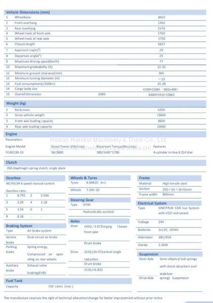 | Drive Wheel | 4x2 | Dimensions (L x W x H) (mm) | 6480x2410x2860mm | |