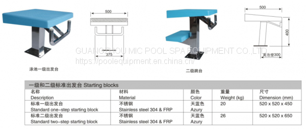 The starting block is made of FRP and conforms to international standards. The surface is anti-slippery. The sustaining bracket underneath is made of 304 stainless steel, which is durable and strong. The starting block measures up international standard. Made of FRP; skid proof surface. Standard size, Superior quality.