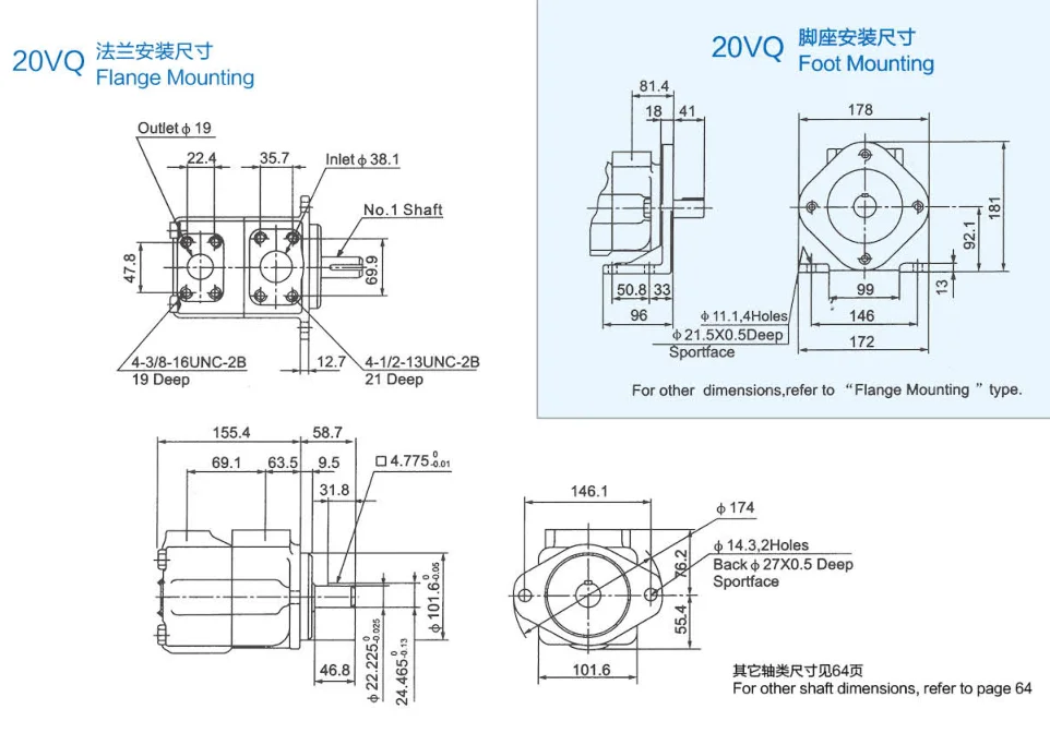 20VQ | 2,3,4,5,6, 7,8,9,10, 11, 12,14 | A-SAE-4 bolt flange | No-marking: Flange Mounting F-Foot: Mountion | -1 Str key -151 Spline | (Viewed from cover end of pump) A-Opposite inlet port B-90°CCW from inlet C-Inline with inlet D-90°CW from inlet | 30 | (Viewed from shaft end of pump) R-right hand for clockwise L-left hand for clockwise |