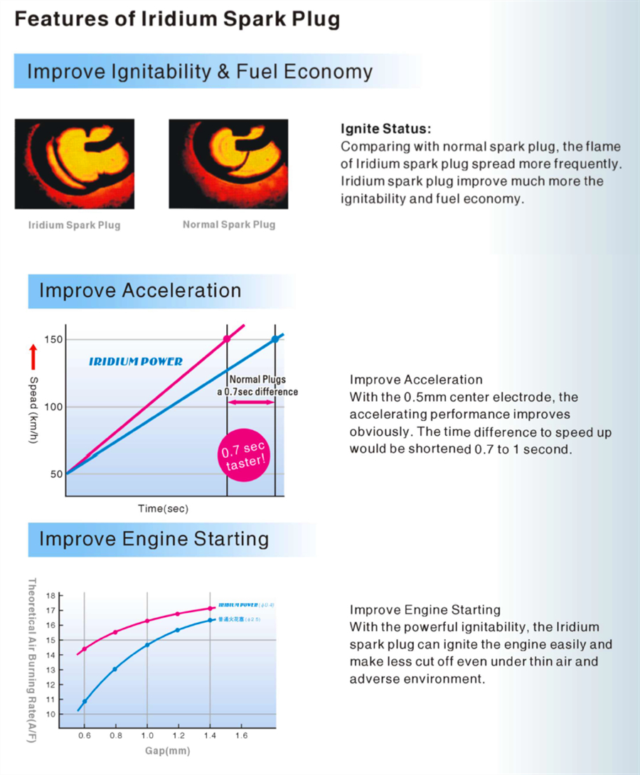 Iridium/Platinum Spark Plug | Center electrode: Iridium Ground electrode: Platinum | Start easy Accelerated fast Combustion Fuel saving | The designed life is 16 W KM The best economic life is 8 W KM | Start easy Accelerated fast Combustion Fuel saving Longer lifetime |