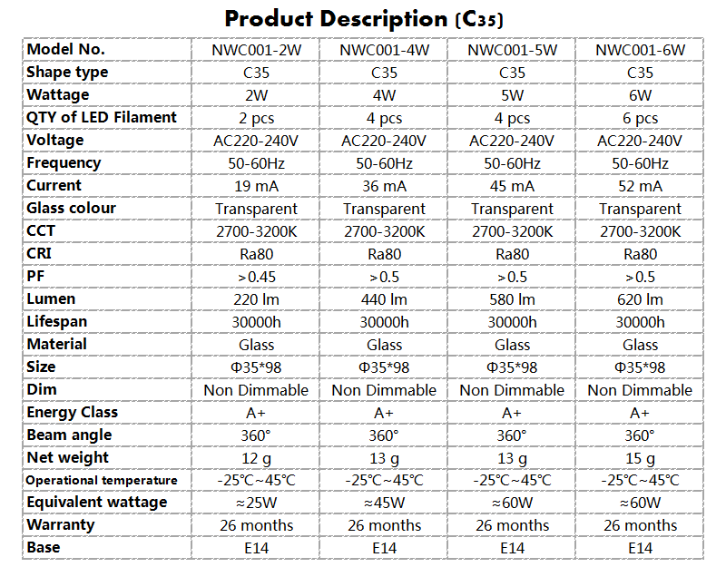 | Working Temperature(℃) | 25, 45 | LED Light Source | LED Filament |
