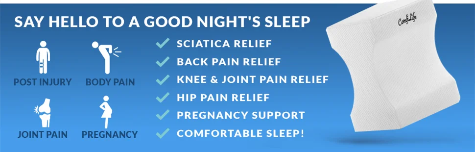 If sciatic pain, lower back pain or hip discomfort keeps you awake at night 100% Memory Foam Knee pillow can help alleviate your pain. Knee Pillow is ergonomically designed to fit comfortably between your legs and provide ideal spinal alignment and support that helps reduce sciatica, lower back, hip or joint pain.