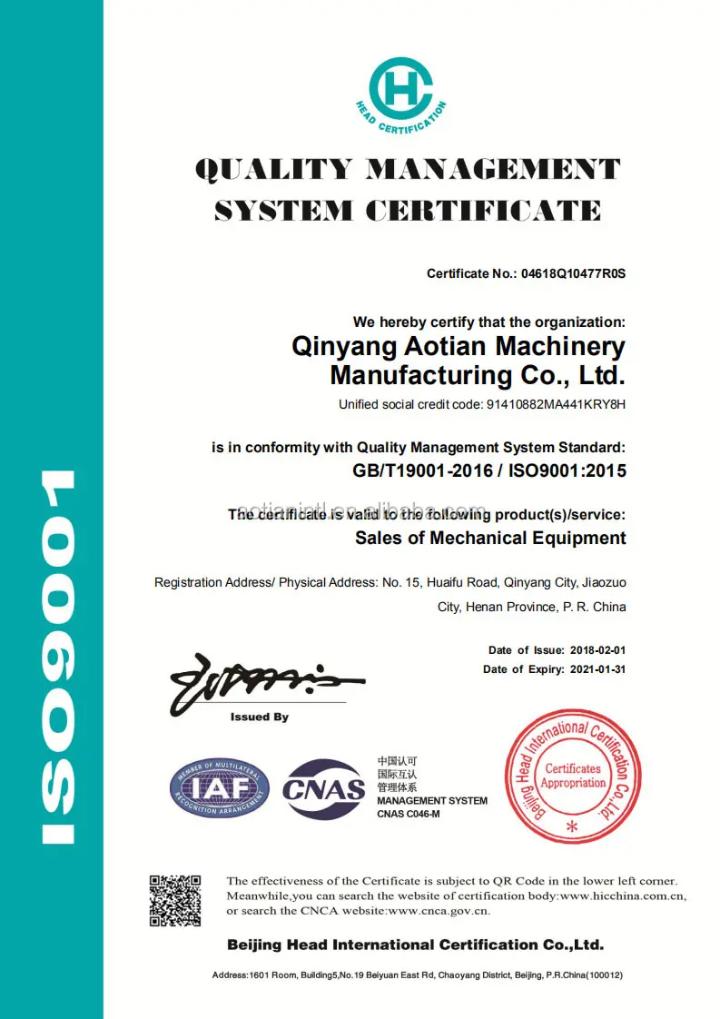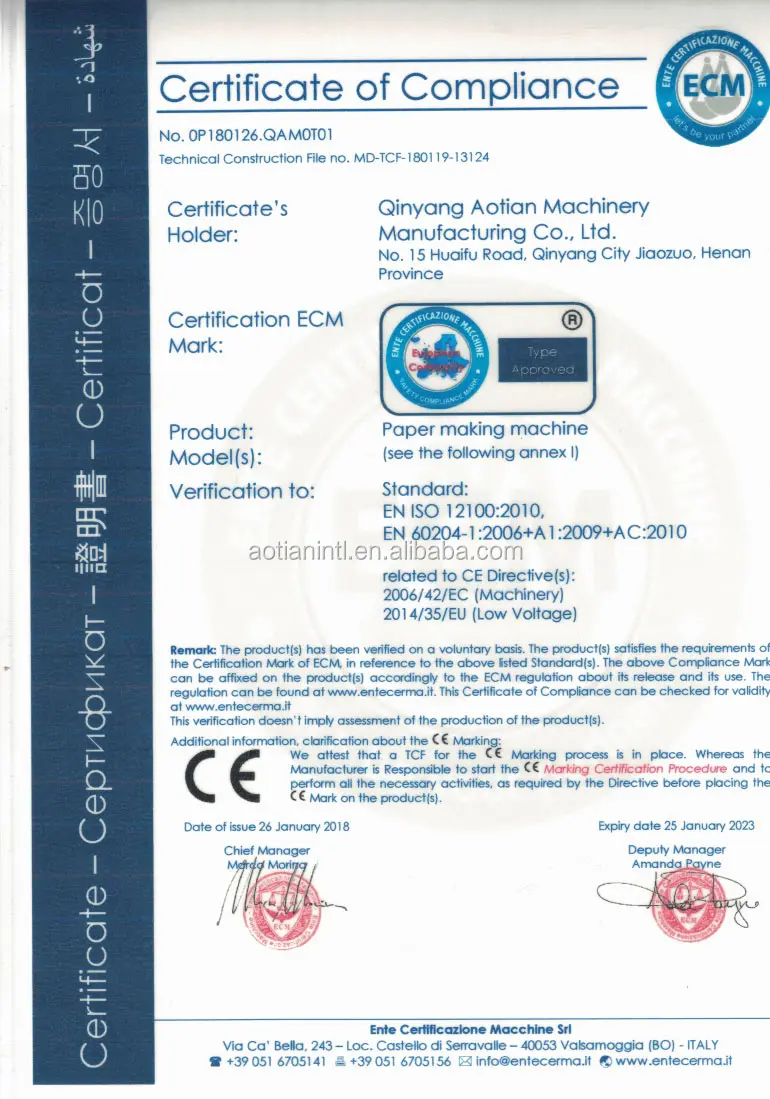 1.Aotian Machinery Manufacturing Co., Ltd. was founded in 1985, it has a leading position in paper machinery of China.We have a professional production, research and development, sales team. Our main products are paper machine,pulping equipment and paper machine parts.And we have the product certificate,we will meet and exceed your expectations. Please contact our custom service for details .