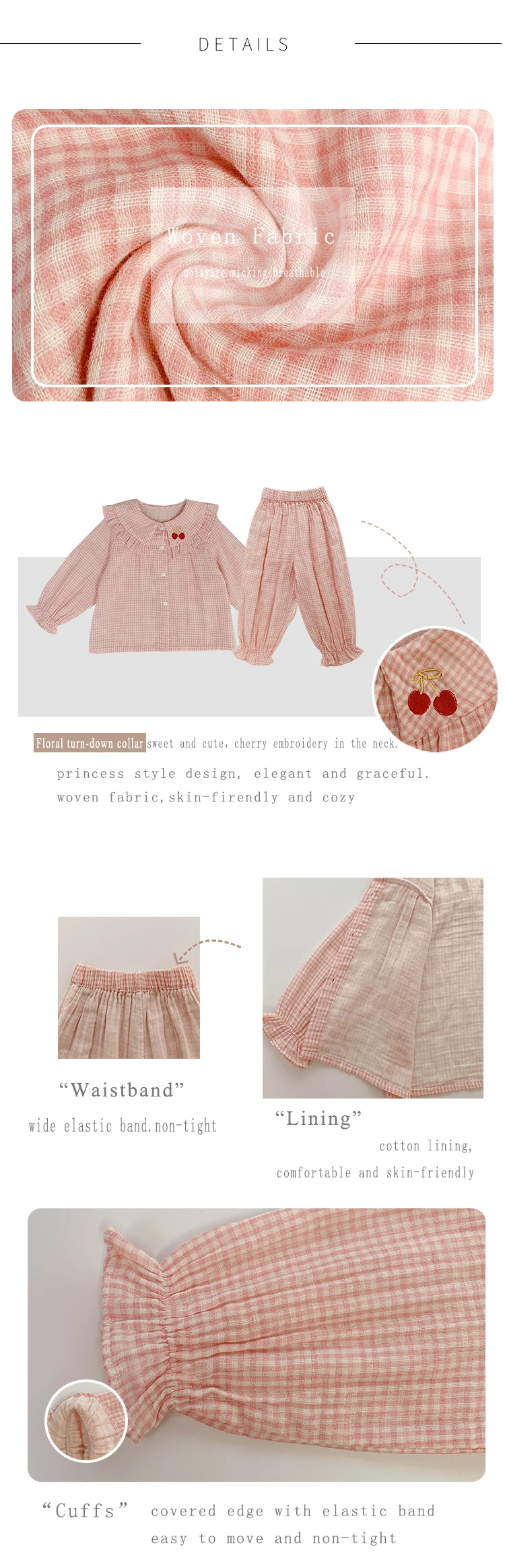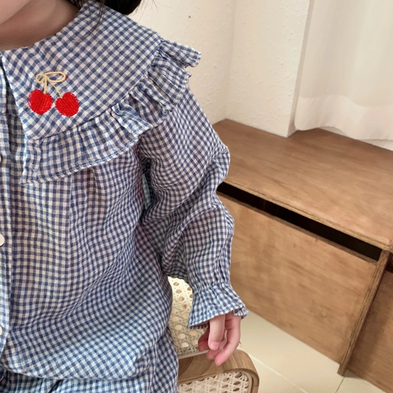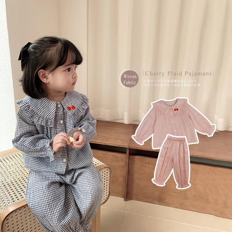 6628/Cute Cherry Embroidery Hot Sell Kids Children Pajamas Sets Long Sleeve Casual Girls Sleepwear