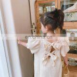 Girls Back Big Bow Cotton Linen Long Dress Cute Kids Puff Sleeve Loose Dresses