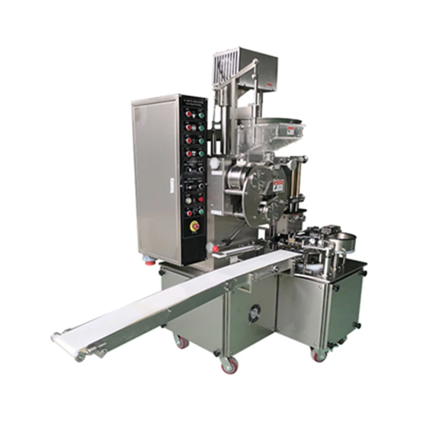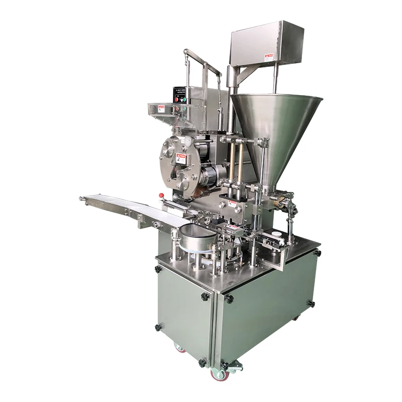 Put dough and stuffing into the hopper, will automatically make skin(skin thickness can be adjusted), cut skin, filling stuffing,then output by conveyor, with high speed, save labor and time, material use stainless steel.