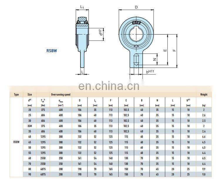 RSBW one way clutch bearing is a sprag type freewheel. It is self-contained, centered by plain bearings for low rotational speeds, and sealed using shield protected metallic labyrinth seals.