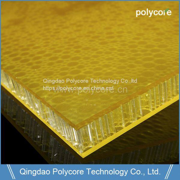 Qingdao Polycore Technology Co.,ltd PC honeycomb composite panel adopted PC honeycomb as core material, polyester material as skin panel to laminated together to make out light weight,stiffness strength,waterproof,fireproof PC honeycomb sandwich panel as decorative panel in many business projects.
