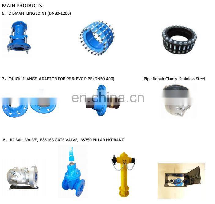 | Certificate | ISO2531, ISO4422, EN545 , EN598 , BS4772 , material : GGG500-7 or other Ductile iron |