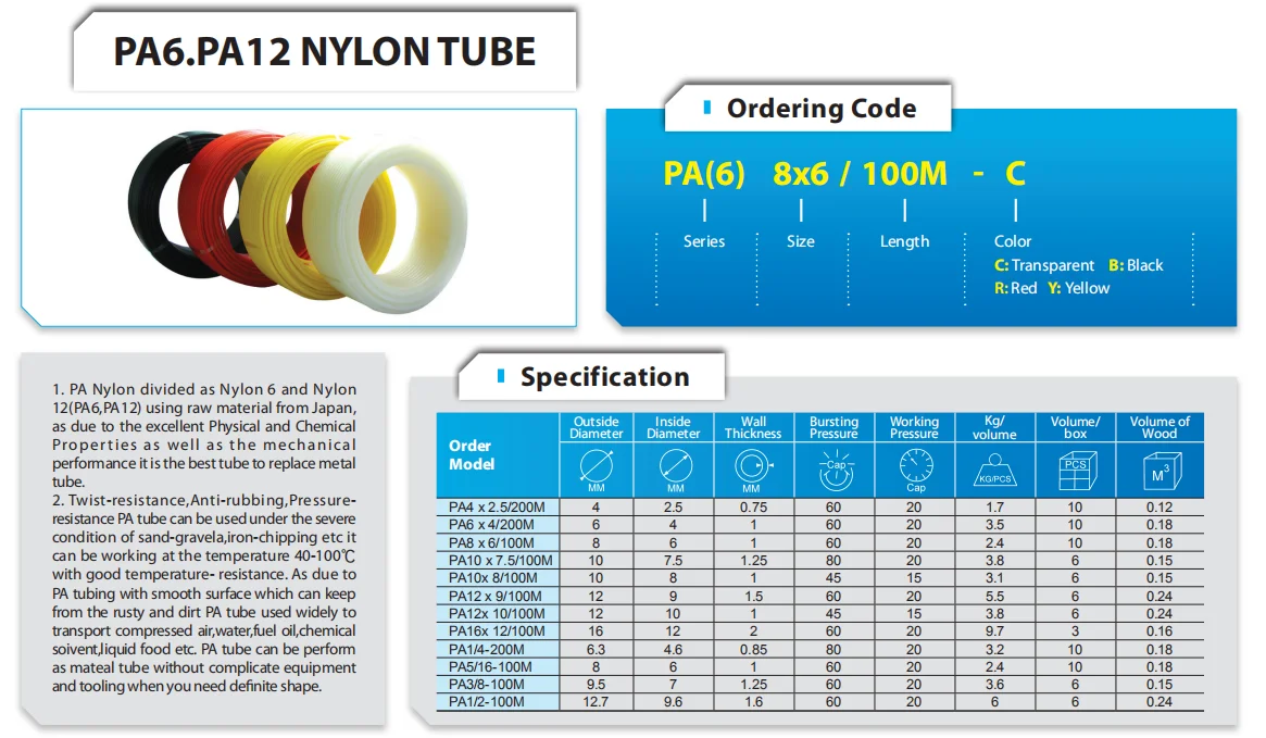 1. PA Nylon divided as Nylon 6 and Nylon12(PA6,PA12) using raw material from Japan,as due to the excellent Physical and Chemical Properties as well as the mechanical performance it is the best tube to replace metal tube.
