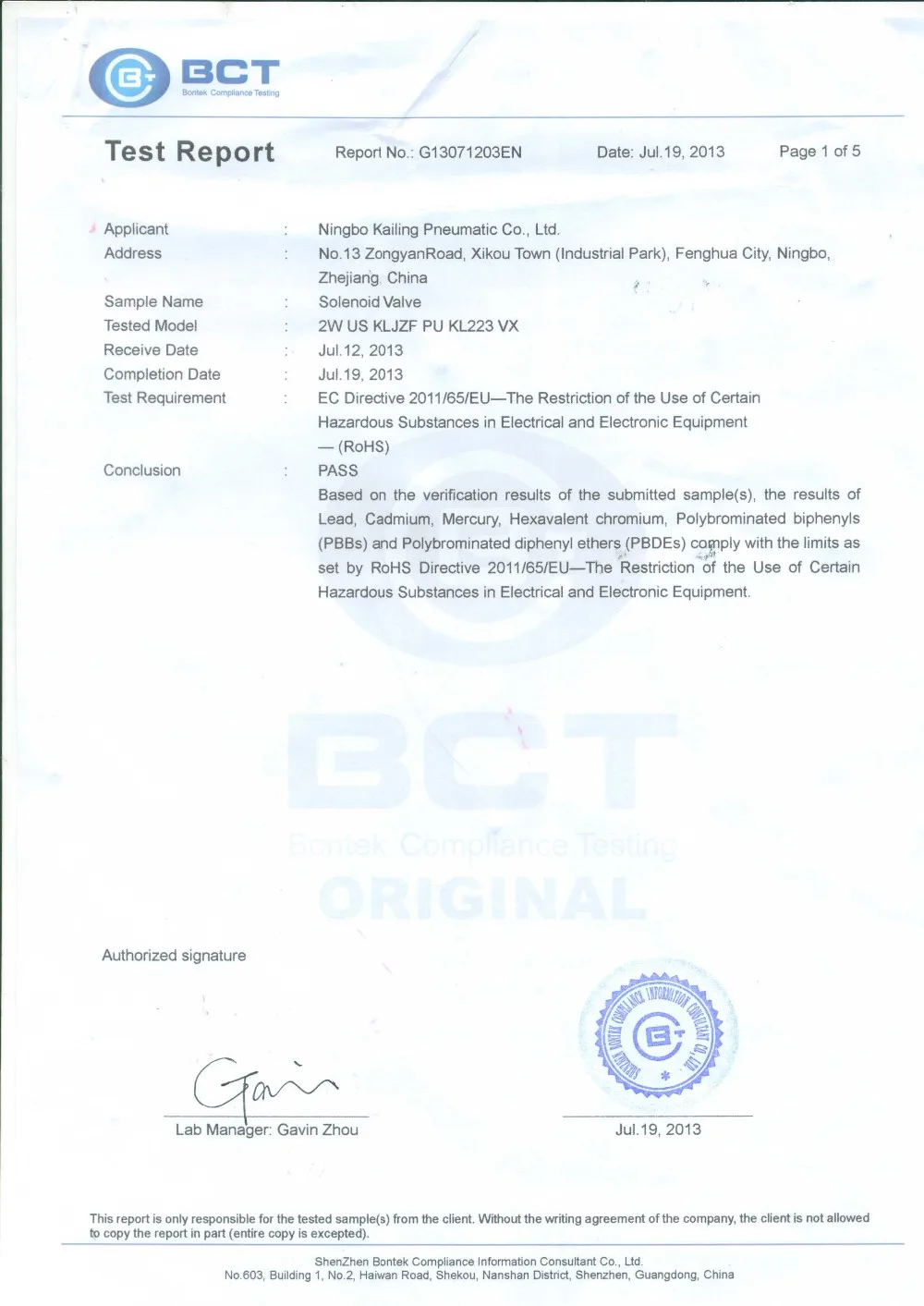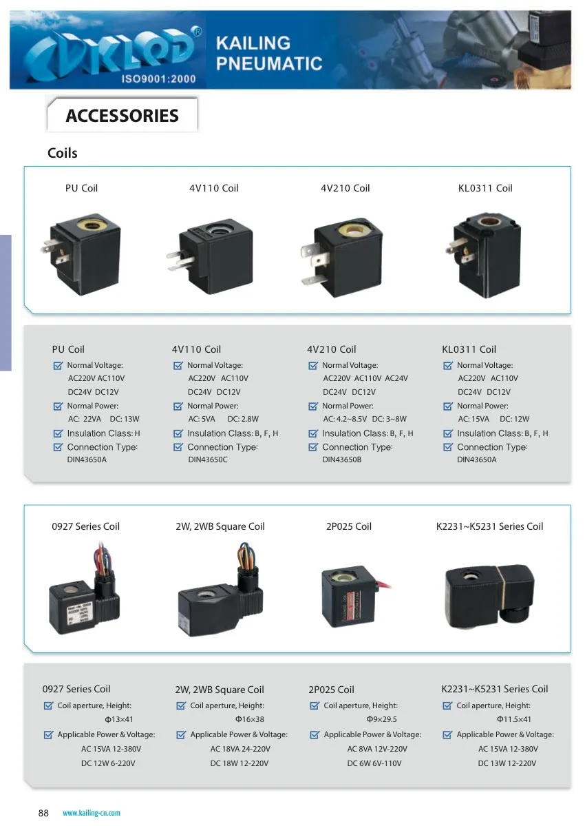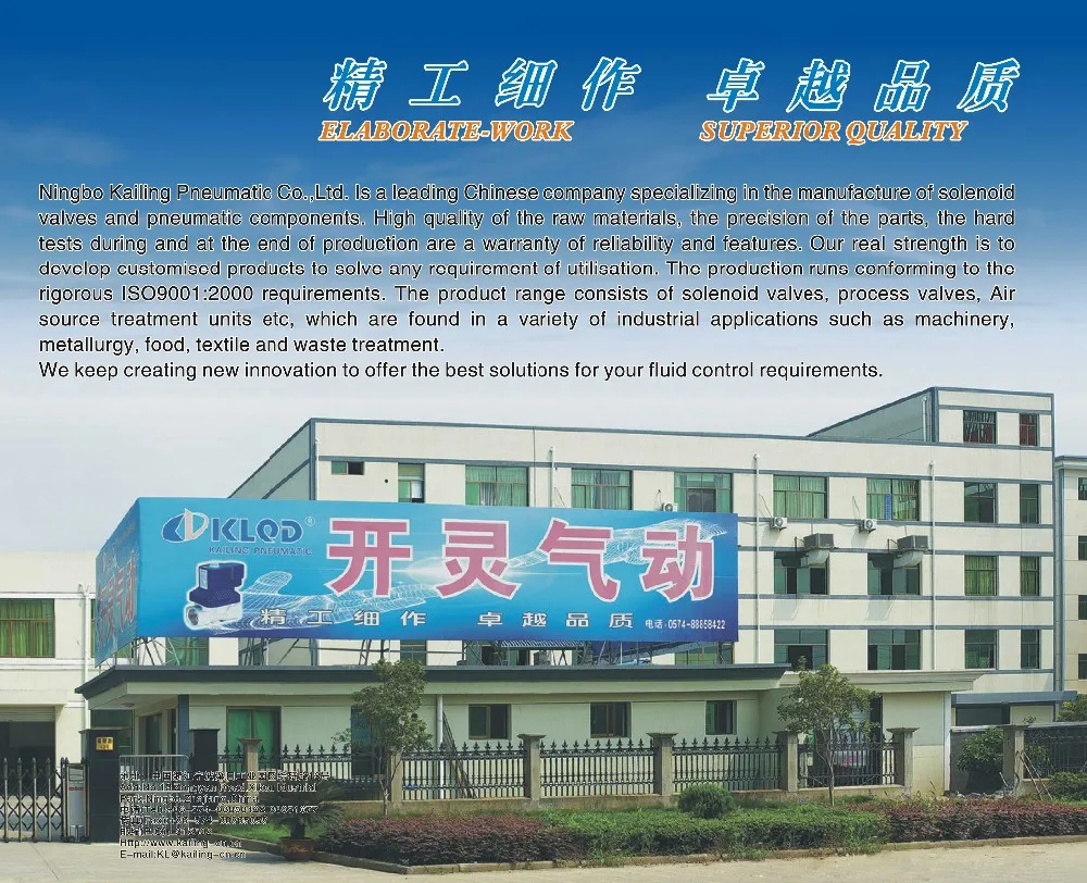 NingBo Kailing Pneumatic Co ,LTD. is a professional company engaged in the production of Solenoid Valves and pneumatic parts.Our company has strong techologies and high capability in research and development of new products.The company has fine workmanship amd perfect inspection techniques. The products include Solenoid Valve , Air source treatment unit , control element and executive element etc which are widely used in industries such as machinery , metallurgy, food , textile and environmental protection.
