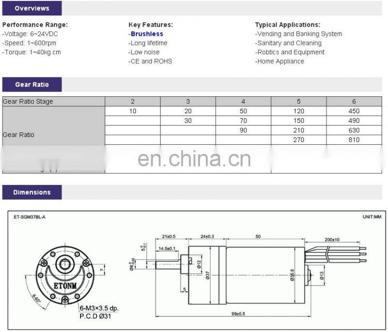 ET-SGM37BL-B 37mm 3.7RPM-300RPM 24V Micro Brushless DC Spur Gear Motor 0.6kg - 35kg