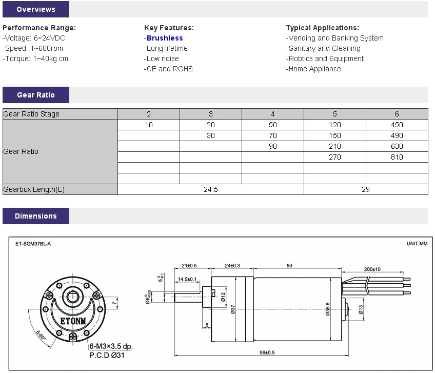 ET-SGM37BL-A 37mm High Torque Low Rpm dc Brushless Gear Motor