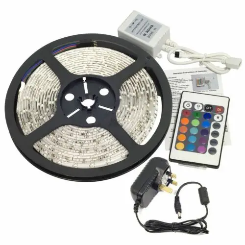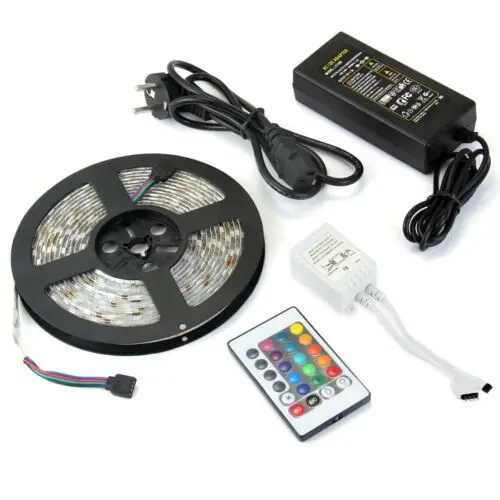 LED Strips Light RGB 3528 SMD Flexible Ribbon 5M Tape DC 12V+ 24 Keys Remote Control +Adapter