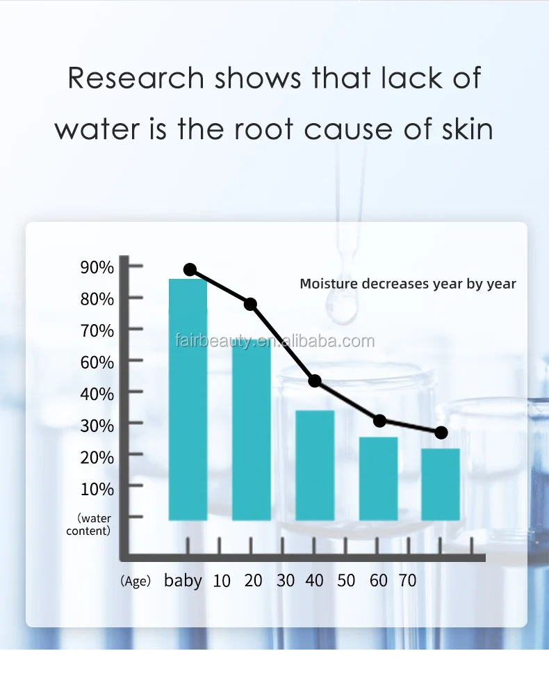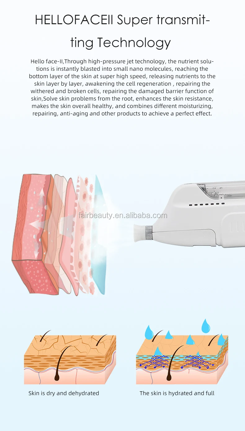 The nutrient solution is instantaneously blasted into small nano-molecules through high-pressure spray technology. The product is kept at a constant temperature of 36 degrees Celsius. The skin instantly cools down and reacts, activating blood circulation to open the pores of the skin, so that the ultra-fine small-molecule nutrition essence rushes in at a microsecond The bottom layer of the skin releases nutrients to the skin layer by layer, awakens the cell regeneration function, repairs the skin withered and broken cells, repairs the damaged barrier function of the skin, solves the skin problems from the roots, enhances the skin resistance, makes the skin healthier, and combines different hydration , Repair, anti-aging products to achieve perfect results.