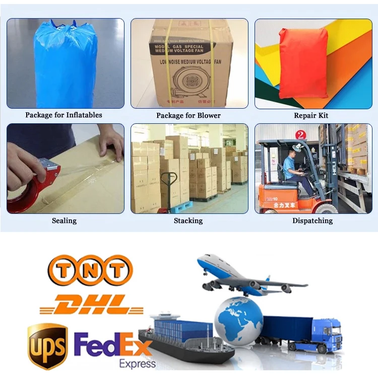 A: It includes inflatable unit, CE or UL approved blower, repair kit, instruction ,etc.
