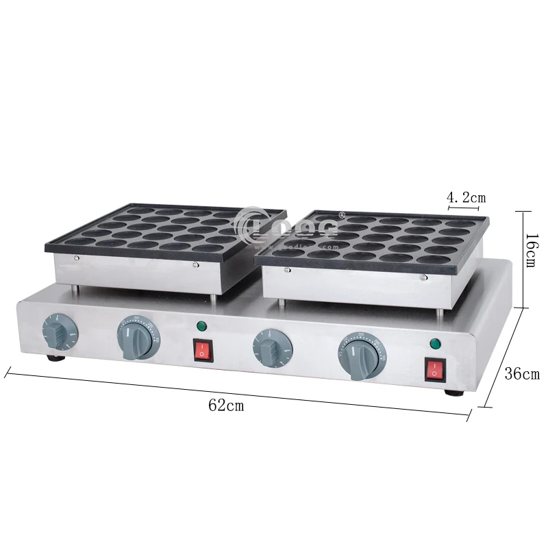 There's two plates of this mini pancakes maker, 25pcs per plate, 50pcs per machine. Thermostat and timer controll each plate separately.