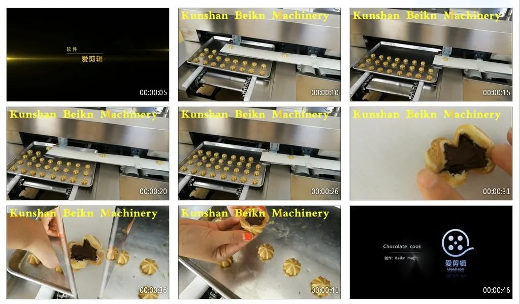 Factory price chocolate cream filled cookies making machine is designed independently by Beikn machinery , which can automatic sprinkling, compact and scientific design make the machine in a stable working condition, much more convinenent than the traditional encrusting machine.