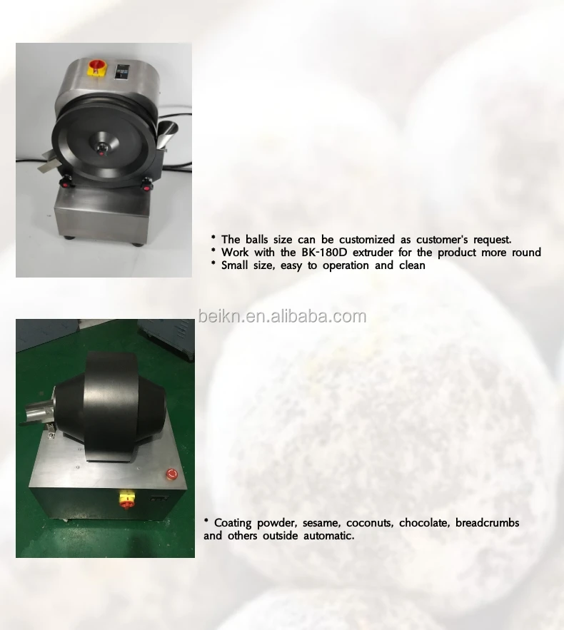 It can make kinds of food balls like energy ball, rum ball, tamarind ball, prodtein bites, rumkugeln, meatball, fish ball, falafel, croquettes, etc.Energy balls machine can work with rounder for round well if high request.