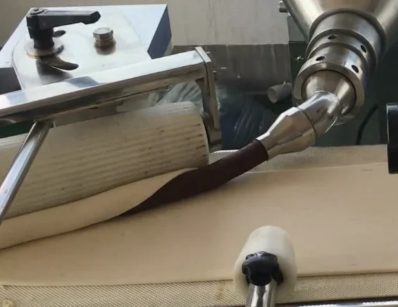 The dough will be rolled by rotary rollers made of twelve roller wheels and a roller wheel by the way of flapping bit by bit to make the dough more polish,weight and quality are stable.Then kneaded by shapely wheel which can adjust the thickness of the dough ,according to the customer's requirements.