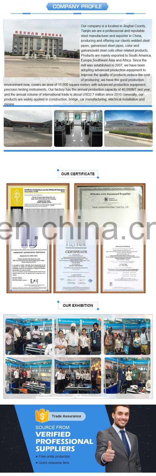 Our company is a located in Jinghai County, Tianjin,we are a professional and reputable steel manufacturer and exporter in China,producing and offering our clients welded steel pipes, galvanized steel pipes, color and galvanizedd steel coils other related products. Products are mainly exported to South America, Europe,Southeast Asia and Africa. Since the mill was established in 2007, we have been adopting advanced production equipment to improve the quality of products,reduce the cost of producing ,we have the good production environment now, covers an area of 15,000 square meters with advanced production equipment, precision testing instruments, Our factory has the annual production capacity of 40,000MT last year,and the annual volume of international trade is about USD2.7 million since 2010.