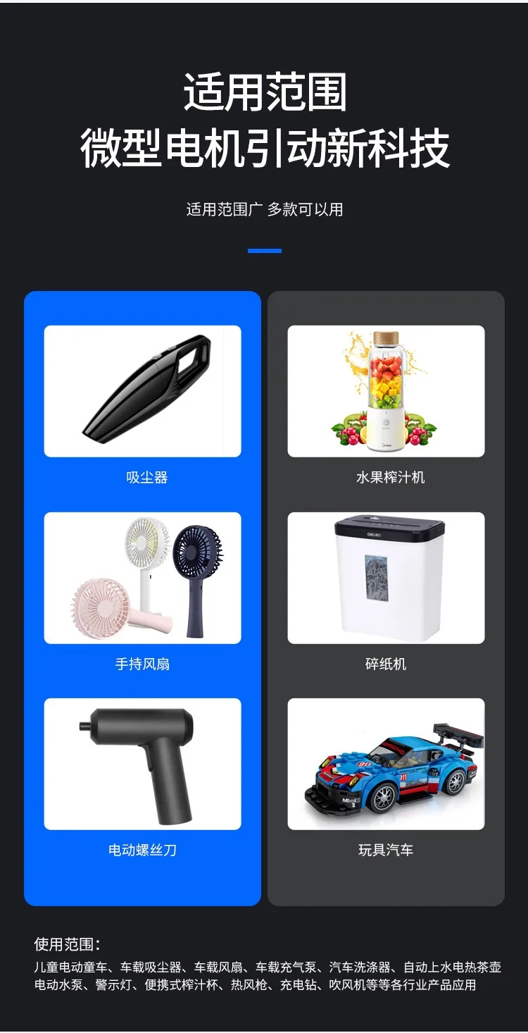 Mainly used in massager, shaver, electric screwdriver, sex products, air pump, water pump, printer, blender, toy model, etc.