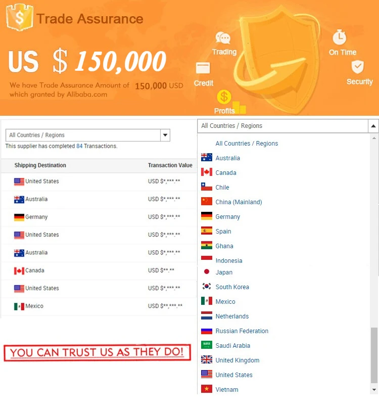 Our firm support third party inspection on our goods, such as BV, SGS, CICC and other inspection institution. We have been cooperating with customers from nearly 20 countries, transaction history can be found in our Alibaba web page.