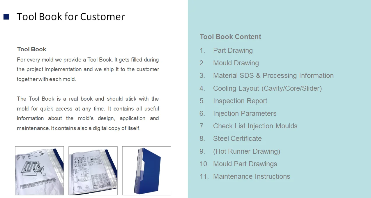 We will pack the mould according to the shipping way, different packaging details for sea, air and land transportation. All the mould components are provided and packed in separated box with clear makring. Plastic samples provided, Toolbook provided.