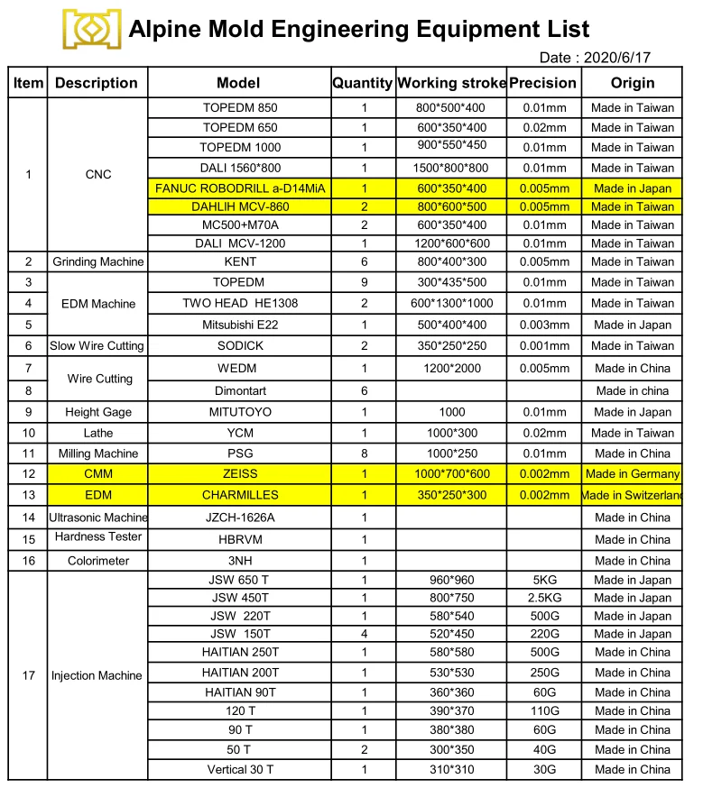 2. ADVANCED FACILITIES: Equipped with the most advanced software for designing, analyzing and manufacturing, Imported a lot of sets high precision plastic injection mold machines from German and Japan, including High Speed CNC, EDM, Wire Cutting Machine, and CMM Inspection Machines and so on.