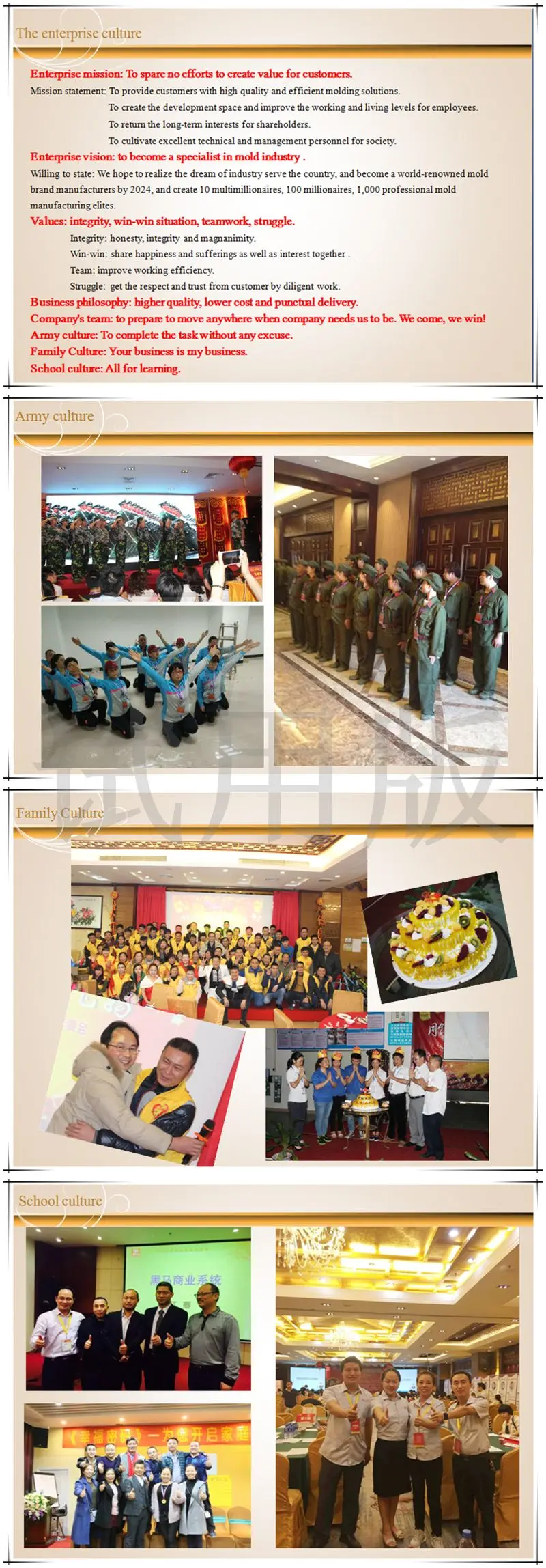 Alpine Mold persists in higher quality, lower cost, punctual delivery as the primary business philosophy. Based on professional, people-oriented, and customer-centered management, Alpine Mold takes "customer - oriented, Quality first" as company`s aim, committed to provide clients with high quality products and overvalued services by right of advanced technologies, scientific management, and continues improvement.