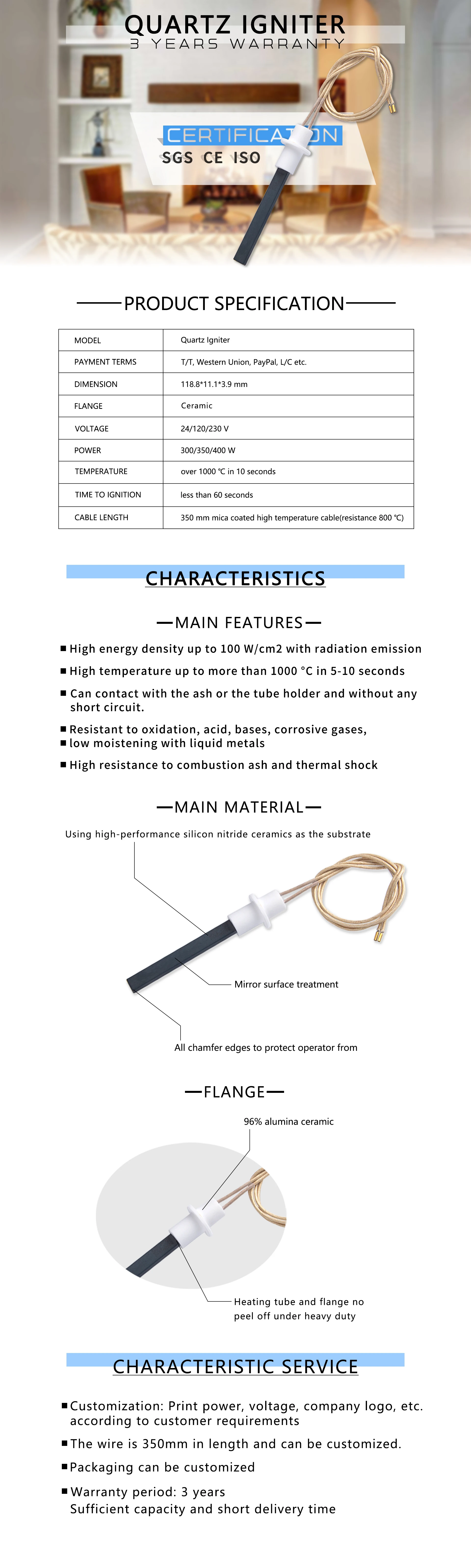 Quartz Igniter for Biomass Burner Fast Heating Ignition Process Reach 1000 Celsius in Less Than 10 Seconds.