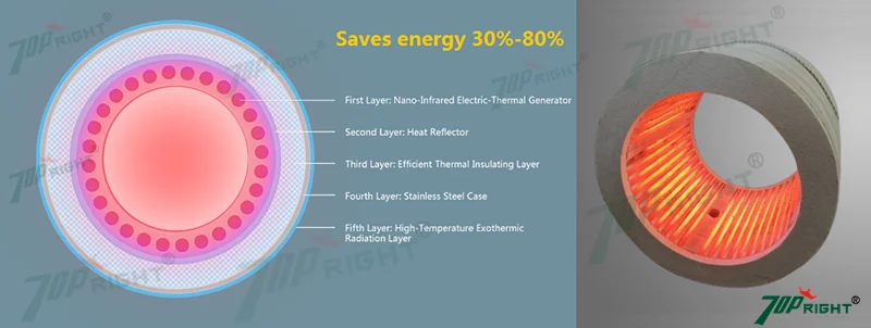 The Topright Brand IR band heater uses high-quality resistance wire, with far-infrared rays and far-infrared radiation tube, radiates heat to the screw barrel of plastic processing equipment. The sheath of the heater is made of thermal insulation layer and multi-layer nano reflective coating, which makes it have high heat conversion rate, good energy saving effect and low surface temperature. It is an advanced heater in plastic machinery industry.