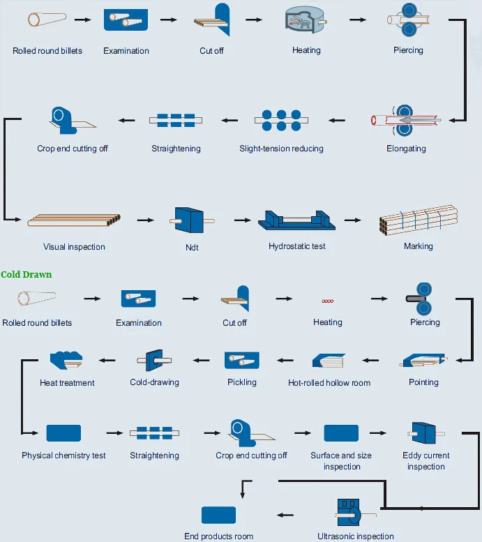The production process of general seamless steel tubes can be divided into two types: cold drawing and hot rolling.Hot-rolled round pipe billet → heating → perforation → three-roll diagonal rolling, continuous rolling or extrusion → stripping → sizing (or reducing) → cooling → straightening → hydraulic test (or flaw detection) → marking → storage precision The tube is made of steel ingots or solid tube blanks through perforation to make capillary tubes, and then made by hot rolling, cold rolling or cold drawing. The specifications of precision tubes are expressed in millimeters of outer diameter * wall thickness. seamless steel tubes are divided into hot rolled and cold rolled (dial) seamless steel tubes.