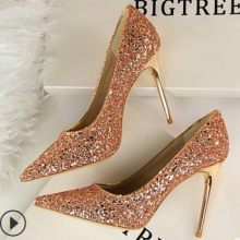 Women's Shoes High Heel Shallow Mouth Pointed Sparkle Sequin Show Thin Night Club High Heel Single Shoes