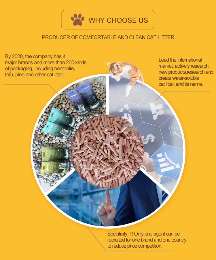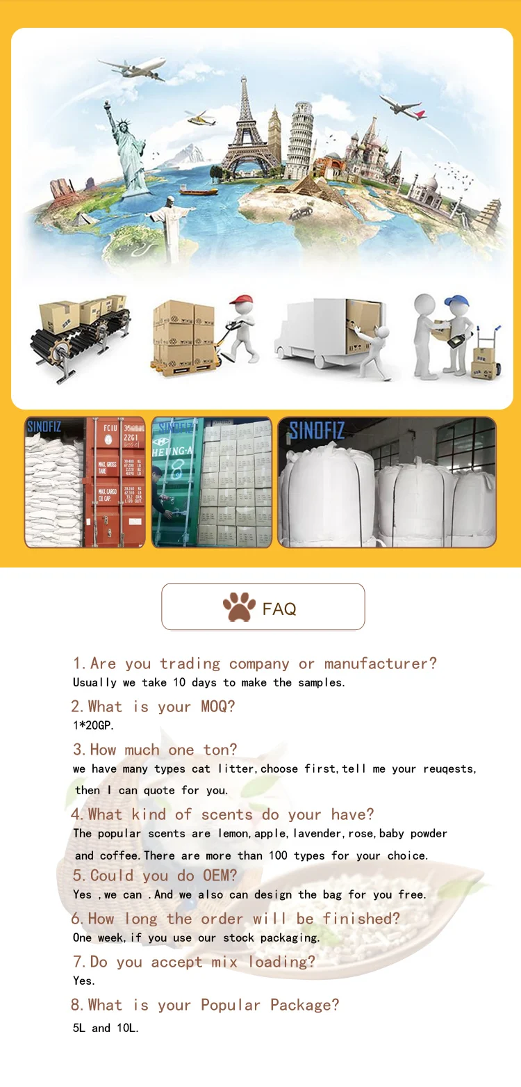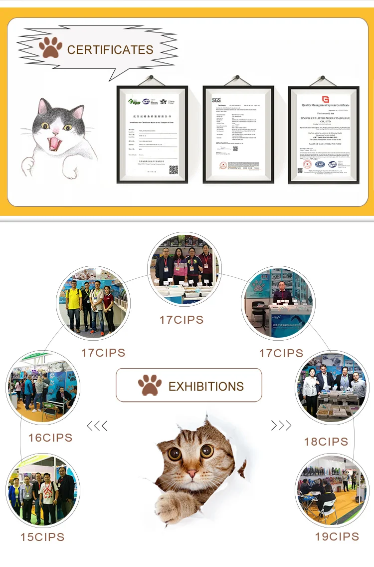 Low dust: applying multiple dust removal technology Quick absorption: 5s absorption Strong clumping: not being broken when falling down from 1 meter height Good deodorization: keeping indoor air free all the time No sticking: full absorption Easy to clean:scoop-able