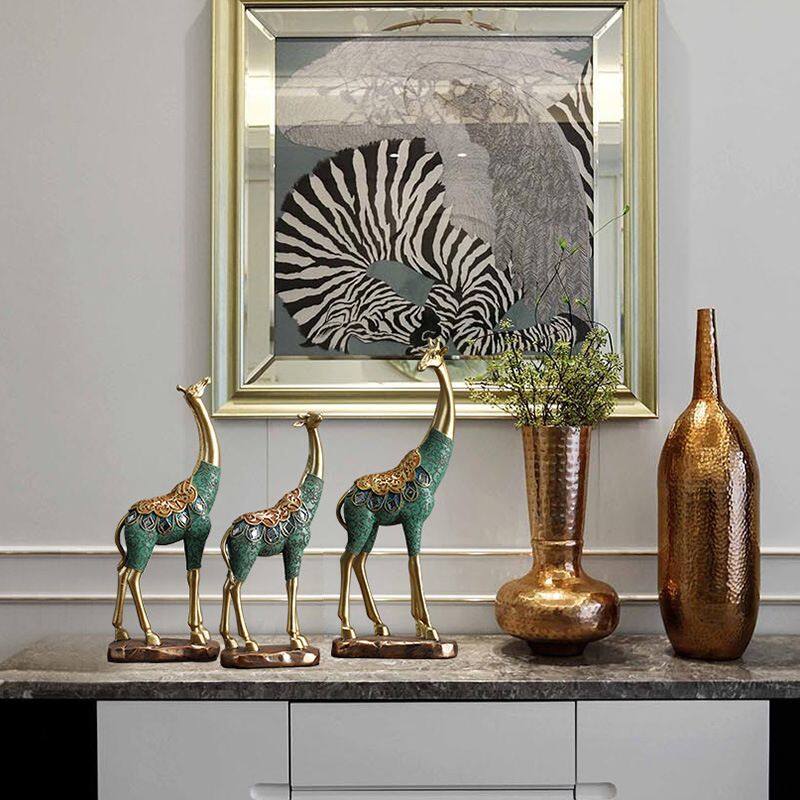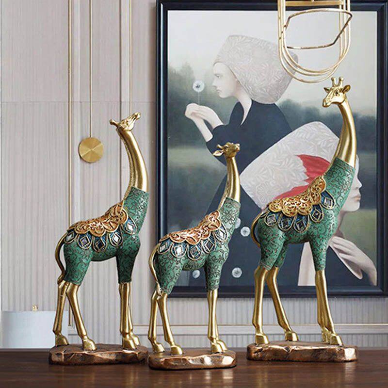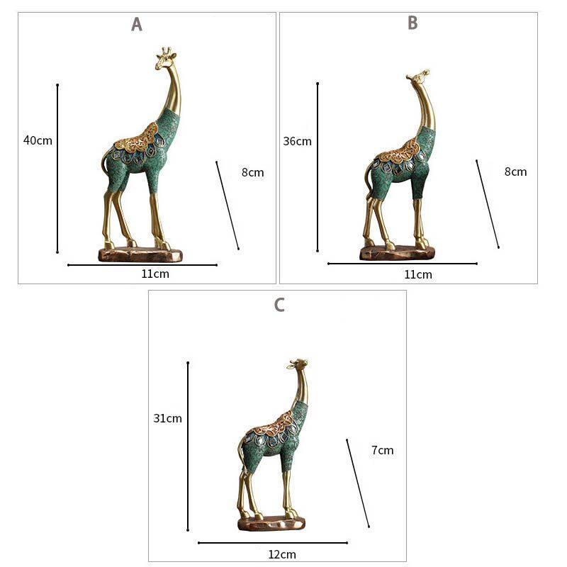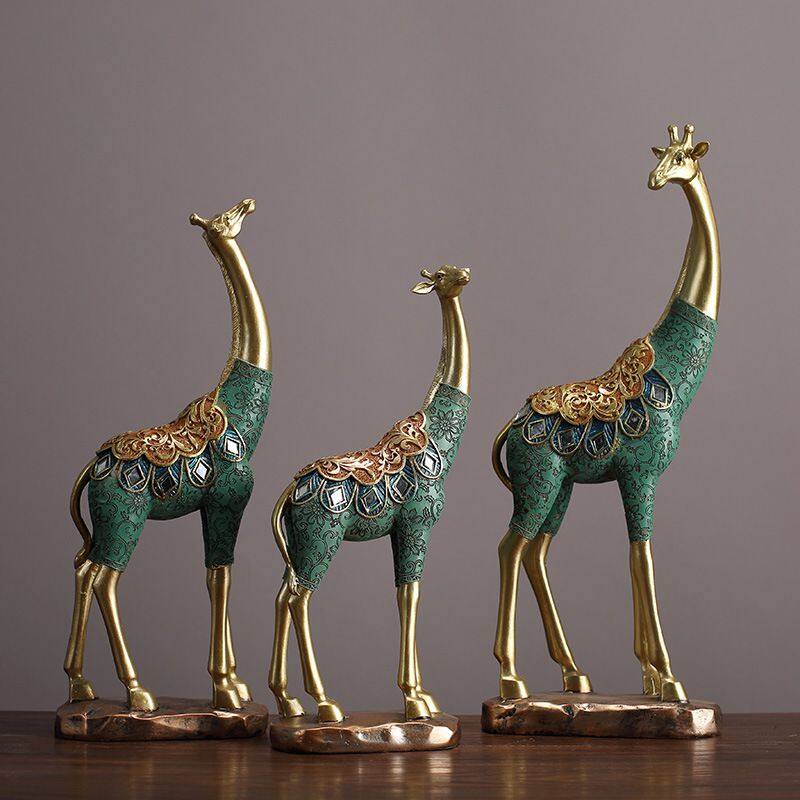 the whole giraffe resin ornament includes three different shape in big ,medium,small size,the mixed color are green and gold color highlights the aesthetics of life, it is a good option for you when decorating a beautful home by yourself.