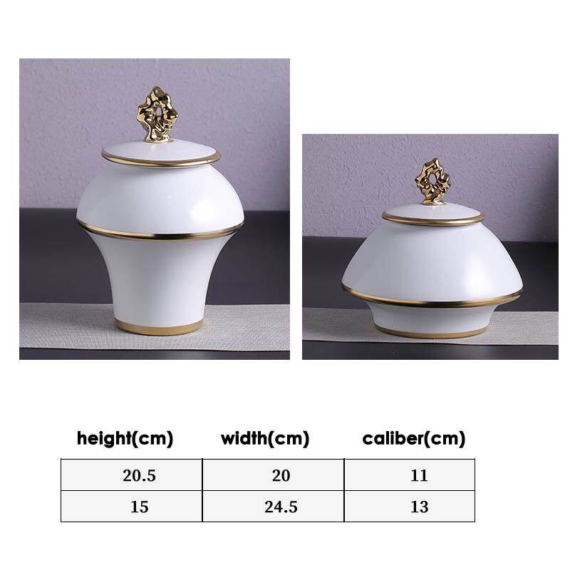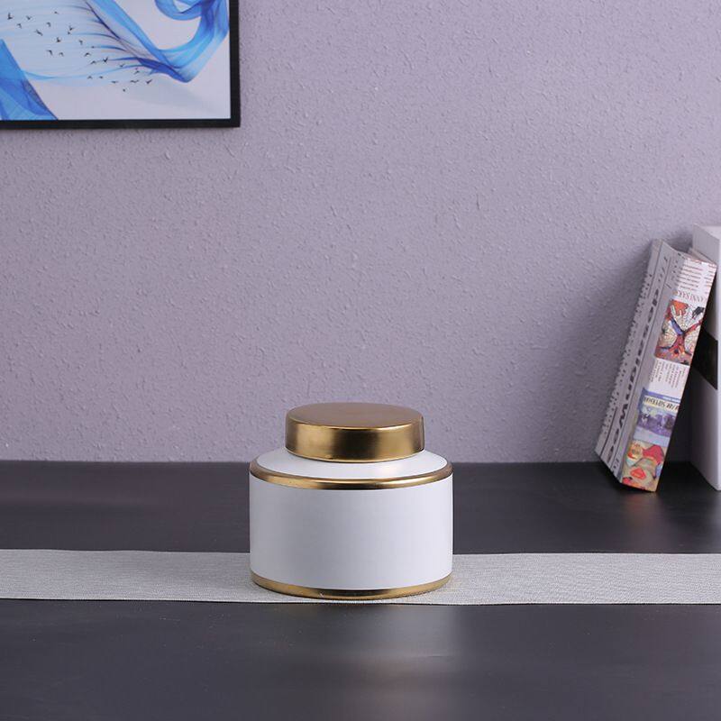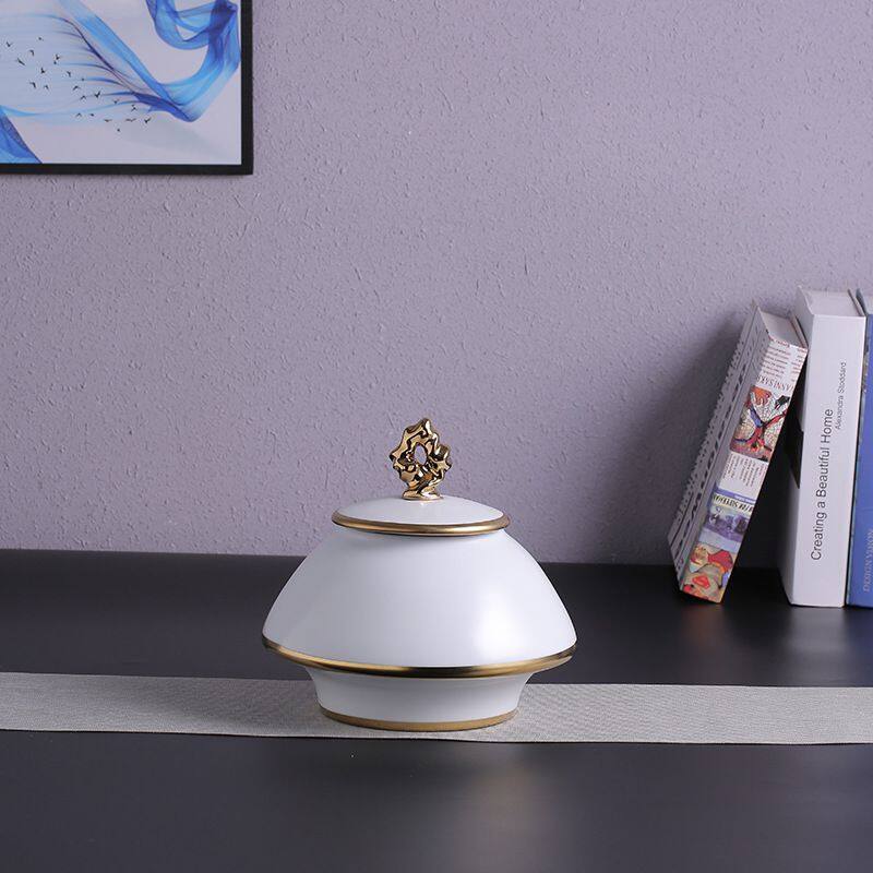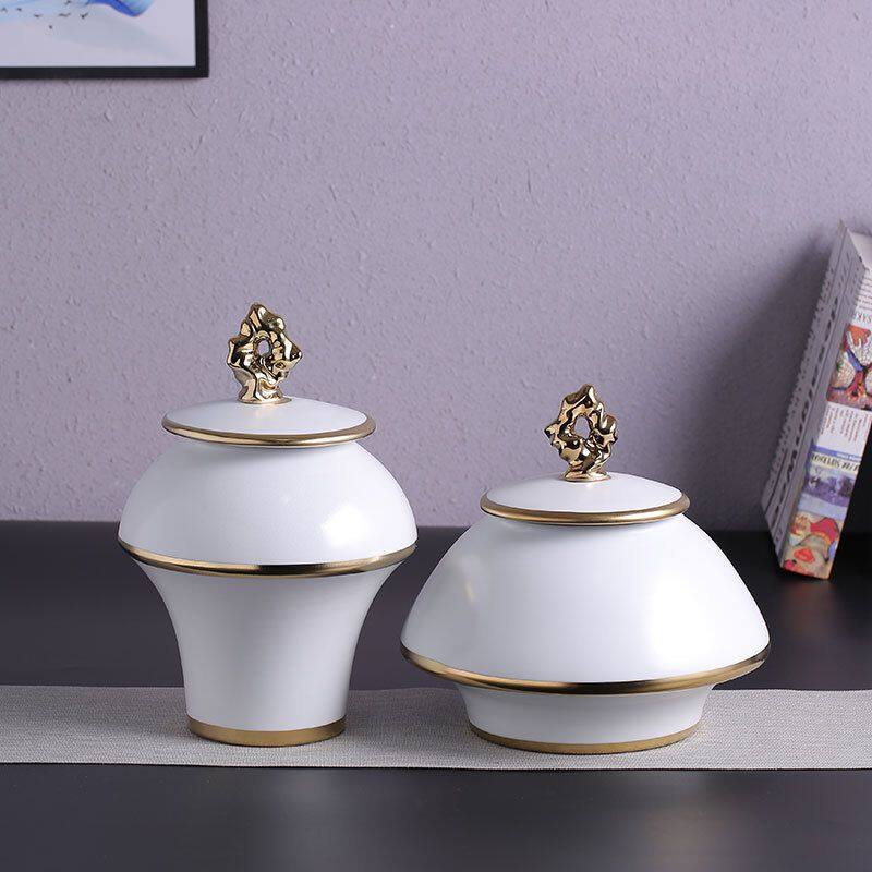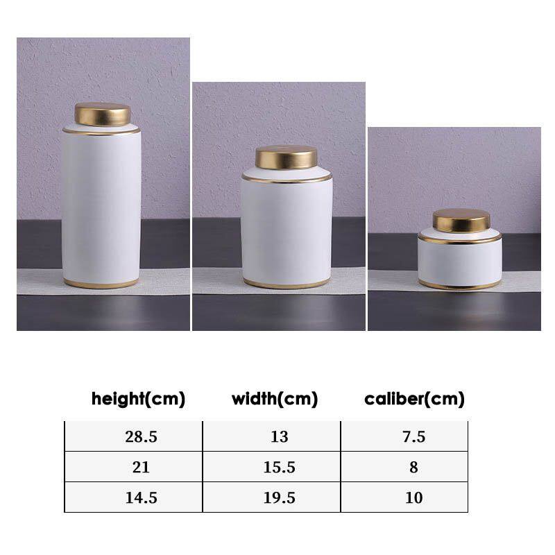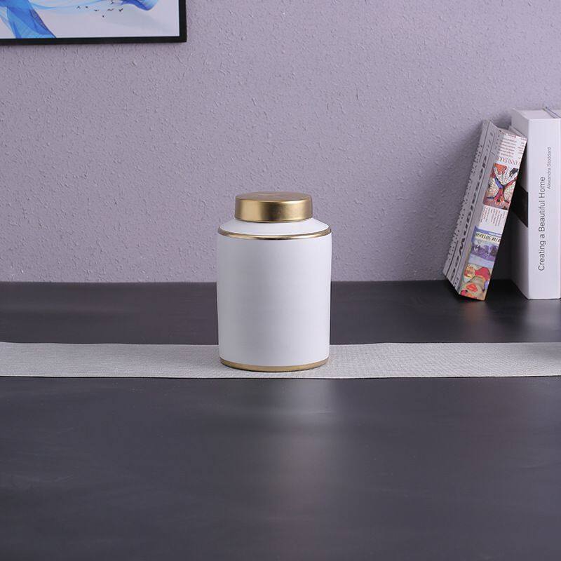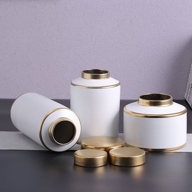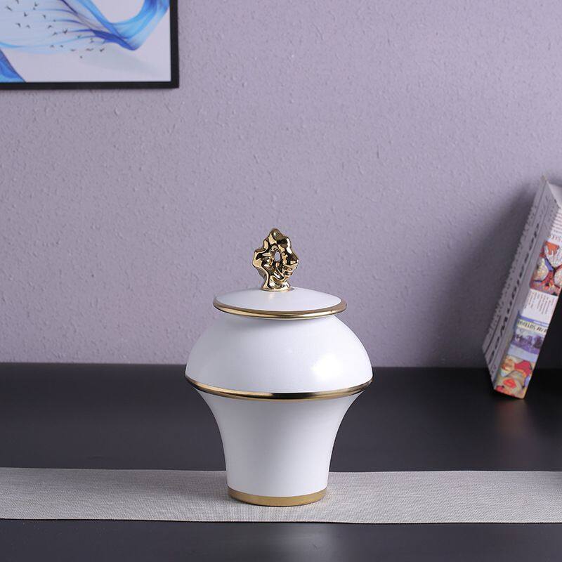 This ceramic vase is a cylinder with a lid. It is made of glaze and gilded surface. It is made half by hand and half by machine.The vase is white and gold plated and comes in five styles.You can customize and print the LOGO.
