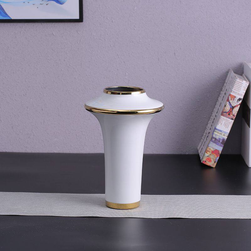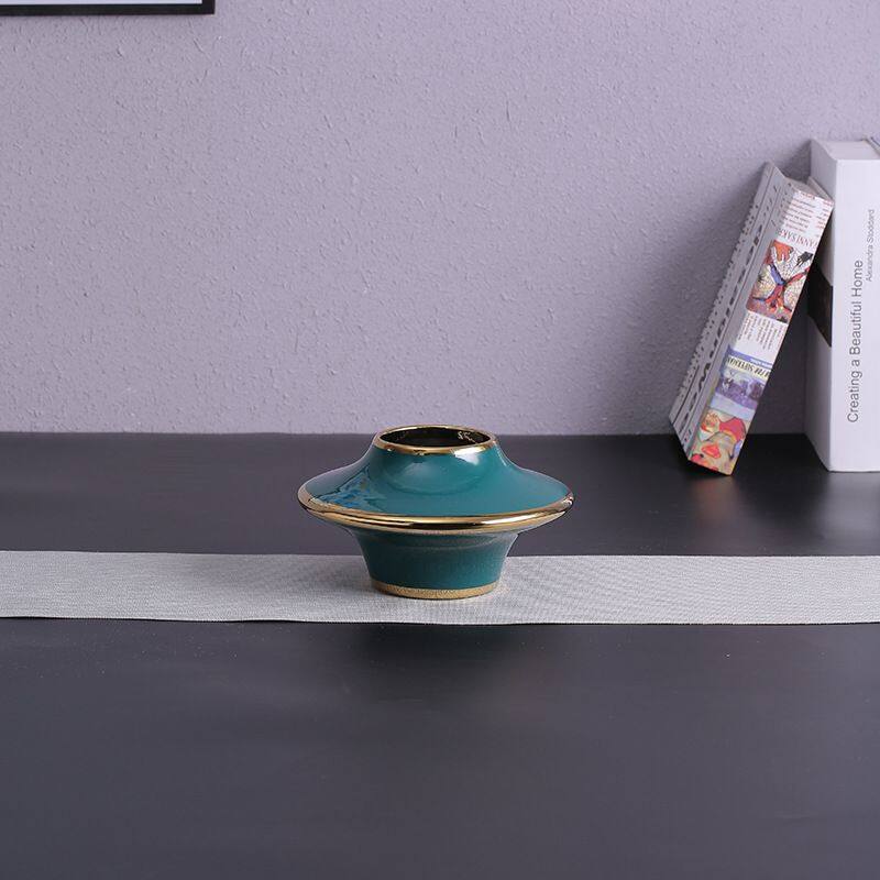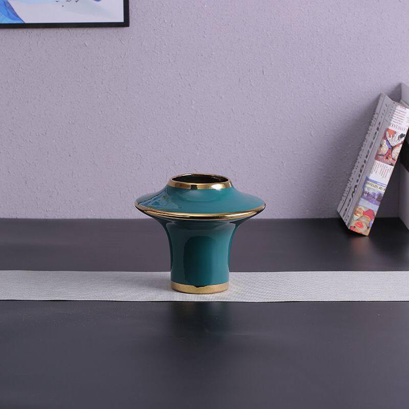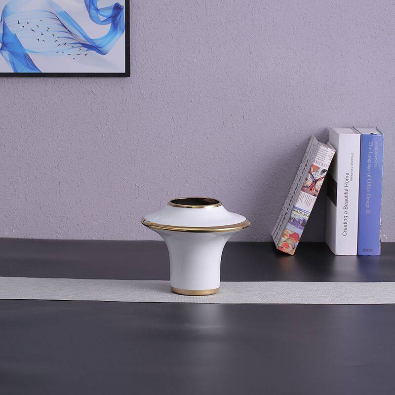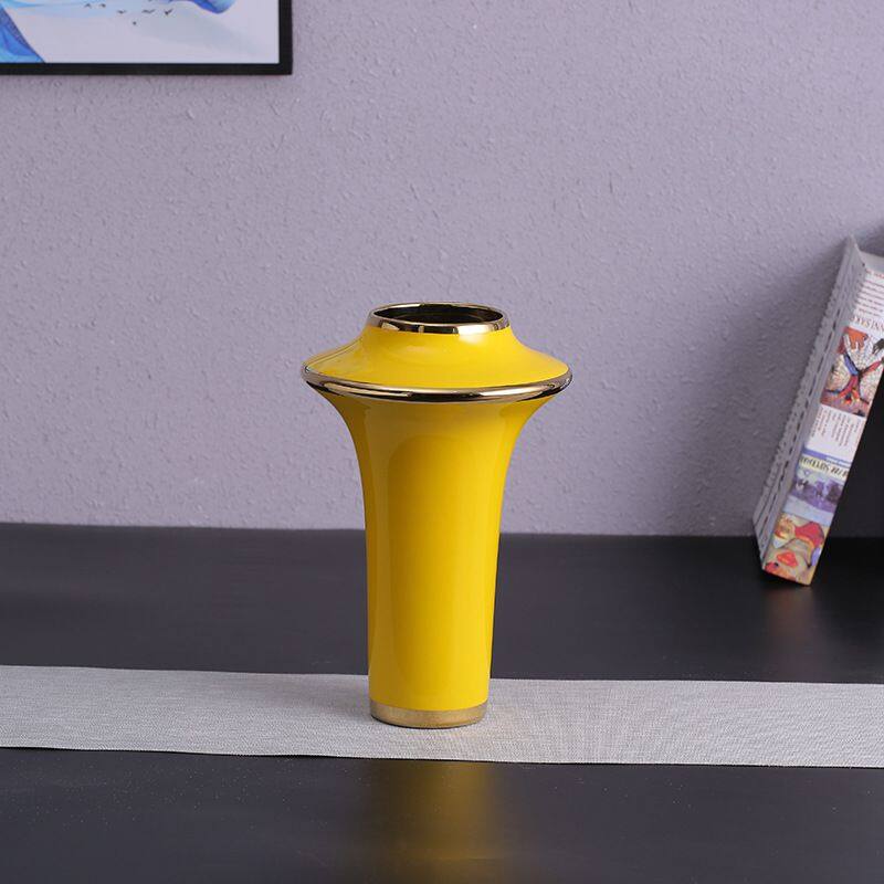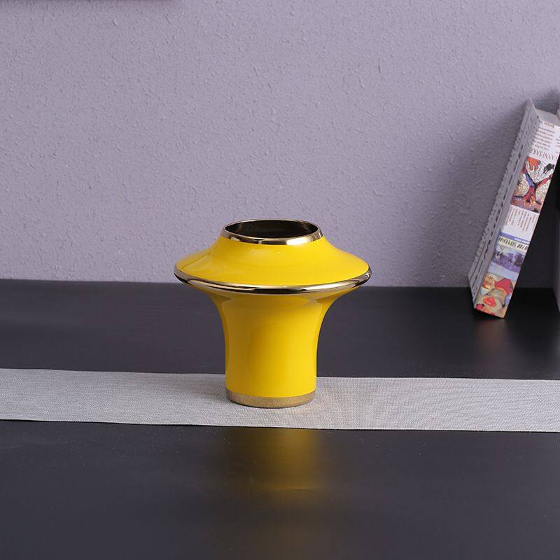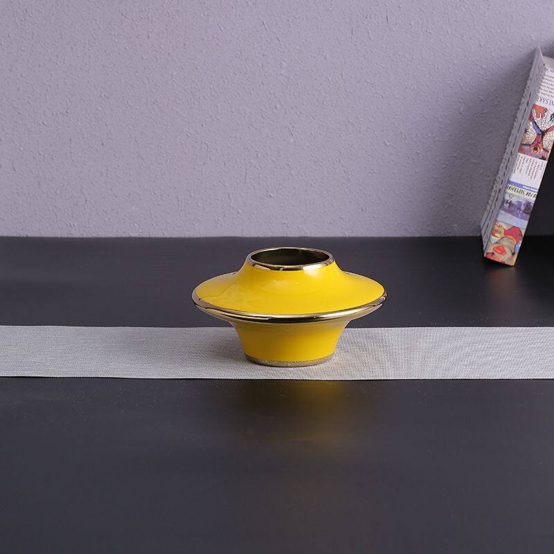 The ceramic vase is a gold-plated flying saucer shaped vase. The glaze process is used, the surface process is carved, and the production method is semi-manual and semi-mechanical.This vase comes in three colors and three sizes. The colors are yellow, white and green.You can customize and print the LOGO.