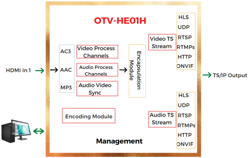 OTV-HE01HH.265/H.264 Video Streaming IPTV 1-Channel H.265 Encoder supports audio and video collection by 1-Channel HDMI input. For HDMI input, which supports output 4 groups IP streams with four different resolution (up to 1080p) and another four different bitrates to meet different size screen and different bandwidth condition. Each group of IP stream supports kinds of main protocols output (HLS, RTMPs, HTTP, RTSP, UDP), this enable Encoder to deliver H.264/H.265 IP streams by independent IP output to various servers for IPTV & OTT application. Such as Facebook Server, YouTube Server, Ustream Server, Adobe Flash Server, Wowza Media Server, and some other servers based on HLS/UDP/RTSP/RTMPs/HTTP/ONVIF protocols. Moreover, providing username, password matching function which required from destination server, to avoid the streaming which does not authorized.