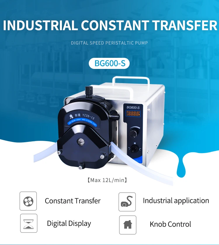 High volume peristaltic pump BG600-S is a digital peristaltic pump with a max flowrate of 12000ml/min, this pump usually used with YZ35 and YZ35-13 pump head, as a large peristaltic pump, can transmit viscous liquids, it’s the first choice for industrial production. Four-digit LED displays the current speed or flow rate, with higher flow accuracy, long life, knob control, and simple operation.This pump is widely used for sewage treatment, gem grinding, mining flotation, distillation extraction, etc.