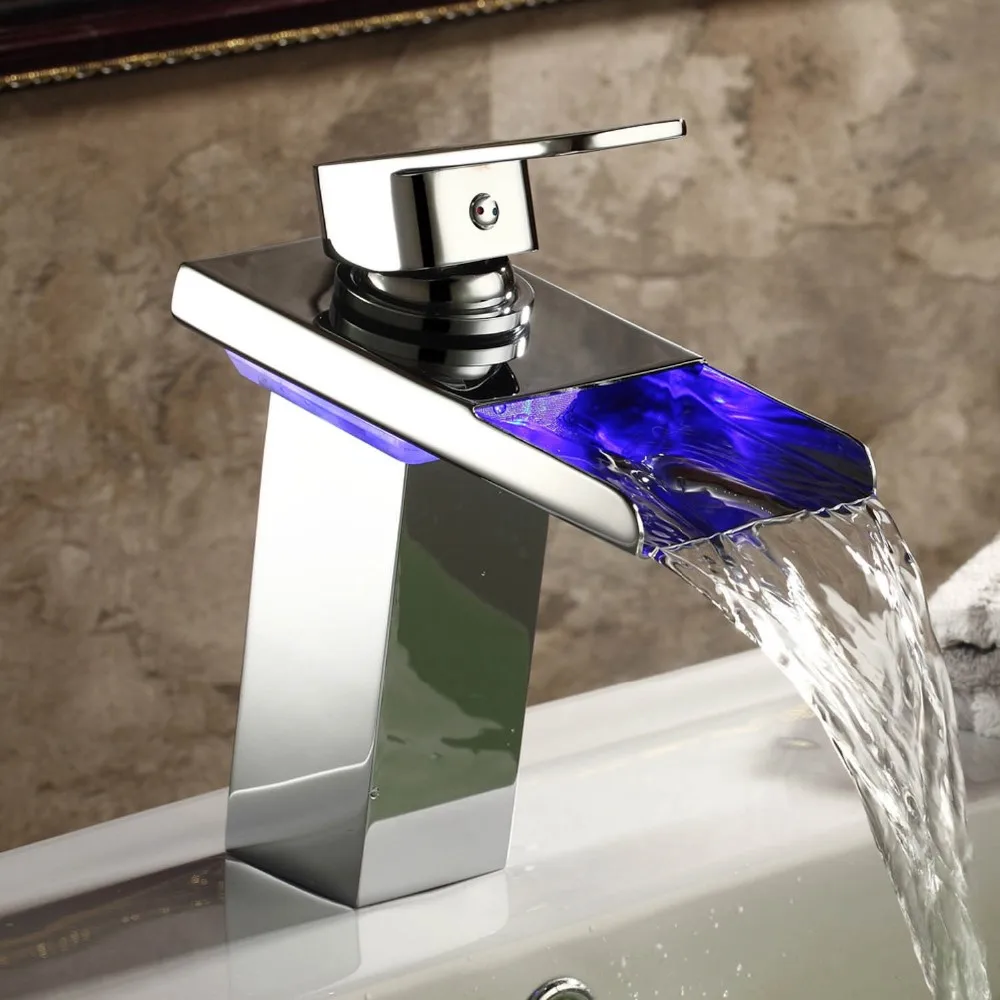 PROWAY Bathroom Spout Waterfall Taps Colorful Basin LED Brass Faucet