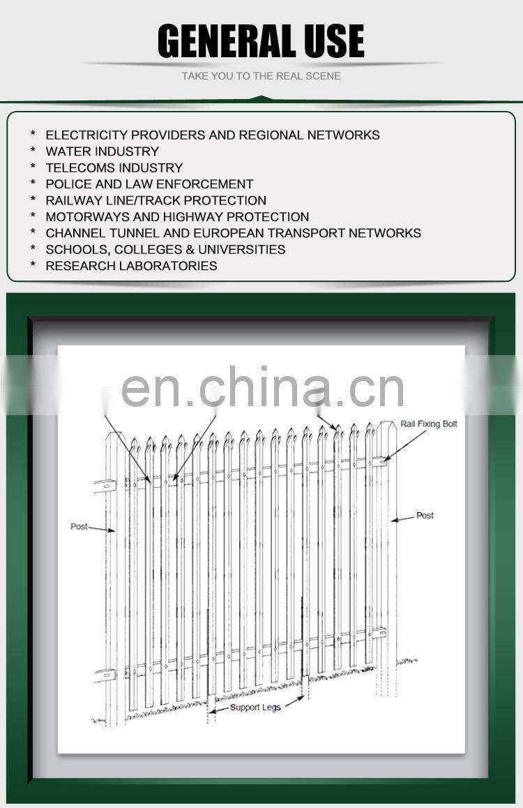 Palisade fence is constructed using a post, rail and paling system. The security level of the fence can be increased by increasing the height of the fence, adding the pale numbers of each panel or increasing the thickness of the pale. The pales are made from hot formed and cold rolled steel belt,These belt offer both strength and rigidity combined with a long life span.