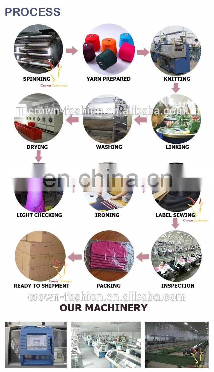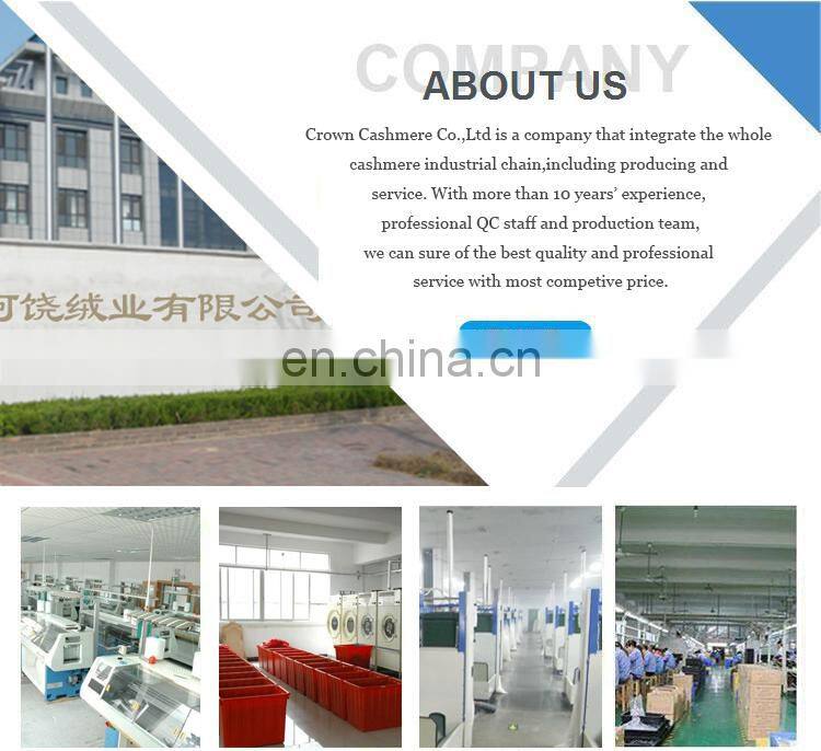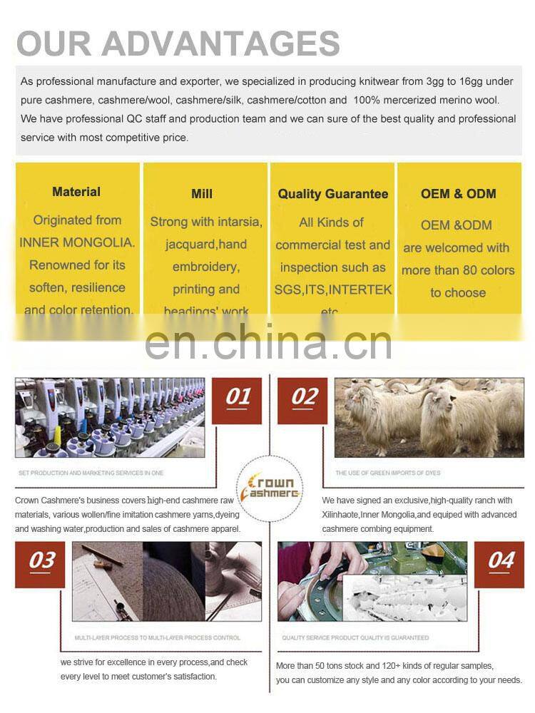 As professional manufacture and exporter, we specialized in producing kinds of ladies', men's and children's/babies' knitwear from 3gg to 16gg such as knitted pullover, cardigan, sweater, pants, glove, hat and scarf, blanket, sock, shoes under pure cashmere, cashmere/wool, cashmere/silk, cashmere/cotton, cashmere/bamboo blended yarn or 100% mercerized merino wool yarn.