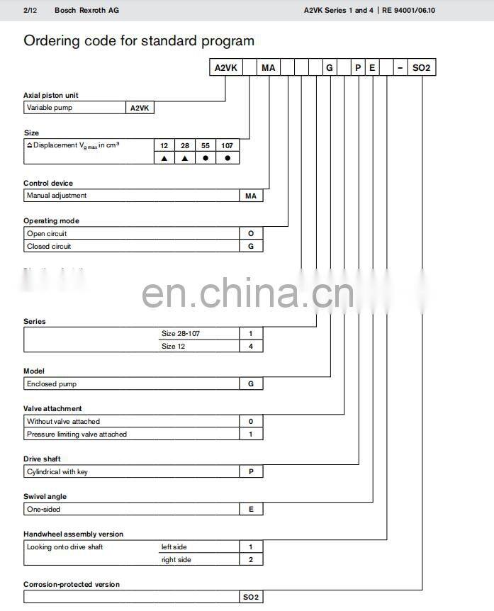 Rexroth A7VK A7VKO A7VKG A7VKO12 A7VKO28 A7VKO56 A7VKO107 A7VK12MA Series Axial Piston Variable Pump A7VK12MAOR1G0PE1-SO2