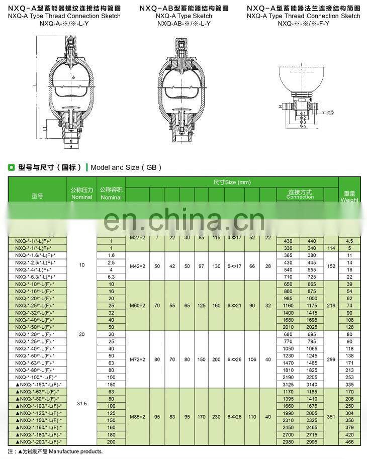 NXQ NXQ-A NXQ-AB series 10MPA,20MPA,31.5MPA bladder accumulator NXQ-0.4/0.63/1/1.6/2.5/4/6.3/10/16-31.5-L