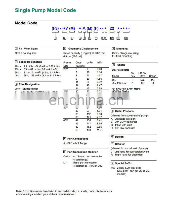 Vickers 20V, 25V, 35V, 45V Series Hydraulic Vane Pump 45V 50A 1C 22