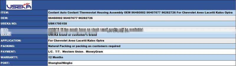 Home > Products > For Chevrolet parts > Coolant Auto Coolant Thermostat Housing Assembly OEM 96460002 96407677 96282726 For Chevrolet Aveo Lacetti Kalos Optra